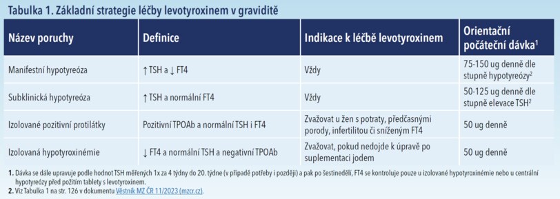 Základní strategie léčby levotyroxinem při záchytu hypotyreózy, izolované hypotyroxinémie či pozitivních tyreoidálních protilátek je v tabulce 1 tohoto dokumentu a podrobně ji upravuje Metodika realizace screeningového vyšetření poruch štítné žlázy v těhotenství, která je uvedena ve Věstníku MZ ČR 11/2023 v tabulce 1 na str. 126 Věstník MZ ČR 11/2023 (mzcr.cz).